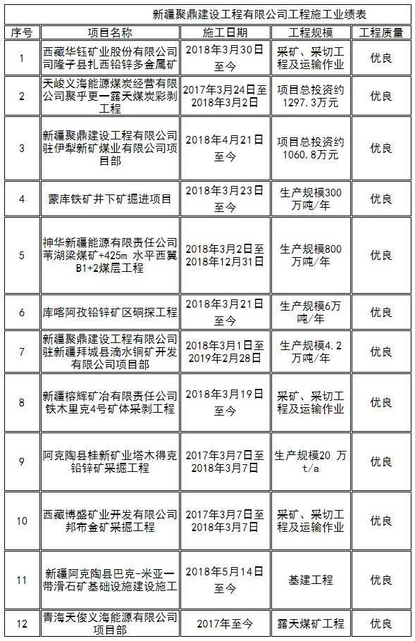 新疆聚鼎建設工程有限公司為國家礦山工程總承包二級企業(yè),創(chuàng)建于2013年,主要從事礦山采掘、隧道開挖、大型土石方爆破、機電設備安裝,水利水電工程,路橋工程等工程施工。